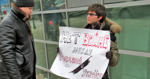"Стыдно молчать. Почти год идет вооруженный конфликт на юго-востоке Украины. Понятно, что это продолжение войны, которую ведет Россия против Украины, чтобы вернуть своих вассалов", - заявил пикетчик, член Международного союза анархистов Борис Стихин в интервью корреспонденту "Кавказского узла".