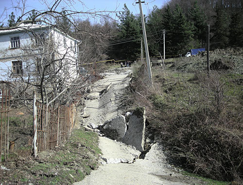 После последнего оползня фундамент дома сдвинулся с места, в стенах образовались трещины. Двухэтажное строение накренилось - любой предмет округлой формы, положенный на пол, тут же скатывается от одной стены к противоположной. Вещи из дома вывезены, осталась только посуда. Хозяева живут у родственников.