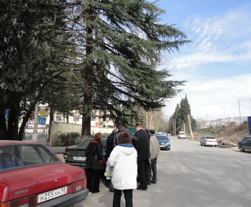 15 марта представители общественности, работники администрации и представители подрядных организаций Росавтодора встретились наЧлены комиссии ищут в плане деревья, подлежащие сносу. Сочи, ул. Чайковского, 15 марта 2011 г. Фото "Кавказского узла" улице Чайковского для контроля за состоянием улицы.