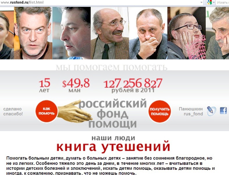 По его словам сегодня уже десятки тысяч читателей верят его фонду, в том числе и посетители сайта фонда. "Этот сайт собирает 5 млн. долларов в год. Читатели дают кто по 10 рублей, а кто - по 100 тысяч рублей, а кто-то и по миллиону. Олигарха - ни одного, но есть состоятельные люди, которые сколотили деньги и хотят помогать другим", - рассказывает руководитель Российского фонда помощи.