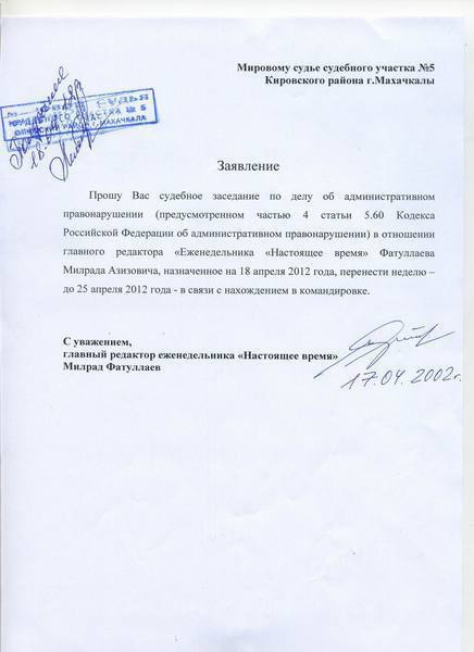 Заявление главного редактора "Еженедельника "Настоящее время" М.А. Фатуллаева к мировому судье с/у №5 Кировского района г. Махачкалы с просьбой о переносе судебного заседания