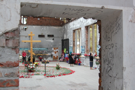 Во дворе школы по-прежнему звучит траурная музыка, через несколько минут исполнится ровно 8 лет, как в спортзале раздался первый взрыв и начался штурм школы.