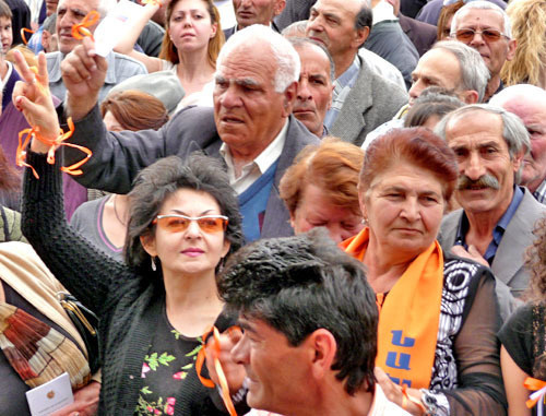 Как сообщал "Кавказский узел", 18 февраля в Армении прошло голосование на президентских выборах. Победу одержал действующий президент Серж Саргсян. Занявший второе место лидер партии "Наследие" Раффи Ованнисян не признает результатов выборов и проводит в стране протестную кампанию. Сегодня его сторонниками был запланирован ряд протестных мероприятий. К 12.00 на площади Свободы собралось около 10 тысяч человек.