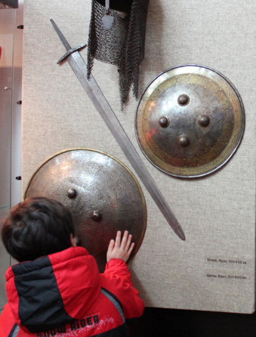 Северная Осетия, Владикавказ, 11 декабря 2013 г. Передвижной музейно-выставочный проект "Легенды Кавказа". Шлем и щиты,  Иран XVI-XVII вв.  Фото Эммы Марзоевой для "Кавказского узла" "Благодаря федеральной поддержке министерства культуры России, прежде всего, появилась финансовая возможность осуществить этот проект для нашего Национального музея, который сегодня реконструируется и не живет полноценной музейной жизнью, показать экспозицию из фондов музея, которые демонстрируются далеко не в полном объеме. Это очень важно для музейщиков - быть в хорошей музейной форме, работать над экспозицией, над изданиями, чтобы наше наследие было вовлечено в культурный оборот нашей страны, чтобы о том, что собой представляет культурное наследие Осетии, знали не только мы, но и жители нашей страны", - считает замминистра культуры.