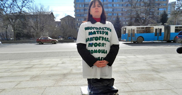 Участница веерной голодовки многодетных родителей мать четверых детей Ольга Ещенко проводит сегодня акцию протеста на коленях на ступенях администрации Волгоградской области.