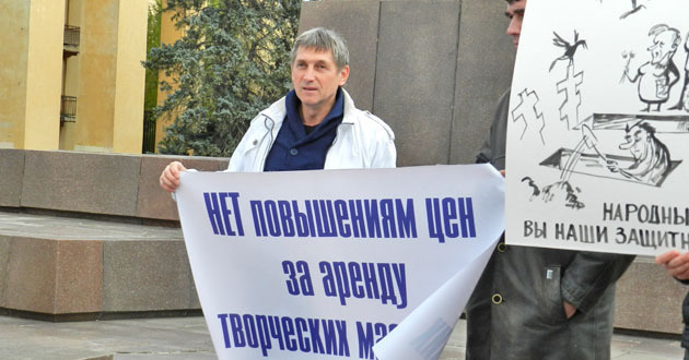 По его данным, участники акции стоят с плакатами: "Власть убивает культуру", "Власть, не залезай в карман художника - там пусто!", "Нет повышениям цен за аренду творческих мастерских!".