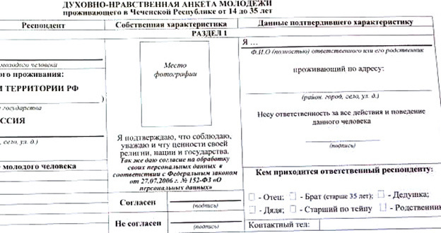 Тем не менее, как утверждают жители республики, власти Чечни не отказались от "духовно-нравственной паспортизации" молодежи, но из-за резонанса реализуют ее под видом анкетирования. Копии анкет появились в Интернете.