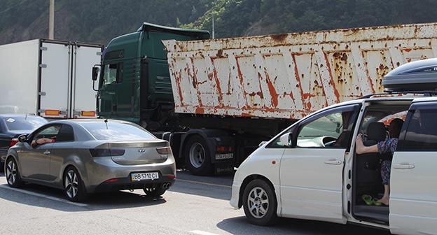 Водители и пассажиры 80 легковых и 70 грузовых машин ожидают пропуска в Грузию на участке Владикавказ - Ларс на Военно-Грузинской автомобильной дороге.