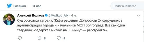 "Допросили двух сотрудников администрации города и начальника МОП Волгограда. Все как один твердили: "Задержал митинг на 35 минут — расстрелять", - написал Волков.