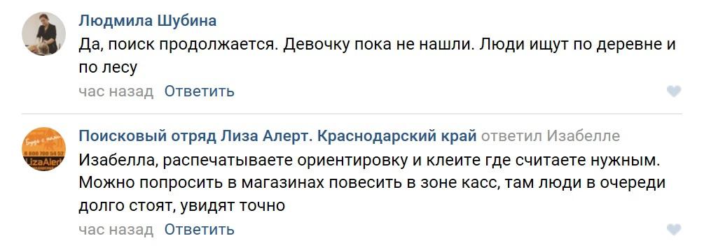 В группе "Поисковый отряд Лиза Алерт. Краснодарский край" в социальной сети "ВКонтакте" выложена информация, что девочка была одета в синюю джинсовую юбку, синюю кофту и красные кеды. Волонтеры, по данным на 09.34 мск, отмечают, что ребенок не найден, и просят людей, готовых помочь, разместить ориентировки и выехать к месту поисков.
