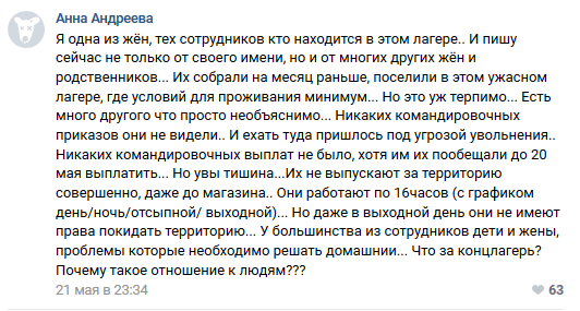 "Я одна из жён тех сотрудников, кто находится в этом лагере. И пишу сейчас не только от своего имени, но и от многих других жён и родственников. Их собрали на месяц раньше, поселили в этом ужасном лагере, где условий для проживания минимум... Но это уж терпимо... Есть много другого, что просто необъяснимо... Никаких командировочных приказов они не видели.. И ехать туда пришлось под угрозой увольнения.. Никаких командировочных выплат не было, хотя им их пообещали до 20 мая выплатить... Но увы – тишина... Их не выпускают за территорию совершенно, даже до магазина.. Они работают по 16 часов (с графиком день/ночь/отсыпной/выходной)... Но даже в выходной день они не имеют права покидать территорию... У большинства из сотрудников дети и жены, проблемы, которые необходимо решать... Что за концлагерь?" - написала в комментарии к посту пользователь соцсети Анна Андреева.
