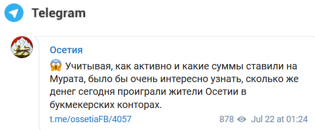 "Учитывая, как активно и какие суммы ставили на Мурата, было бы очень интересно узнать, сколько же денег проиграли жители Осетии в букмекерских конторах", - отметил 22 июля Telegram-канал "Осетия".