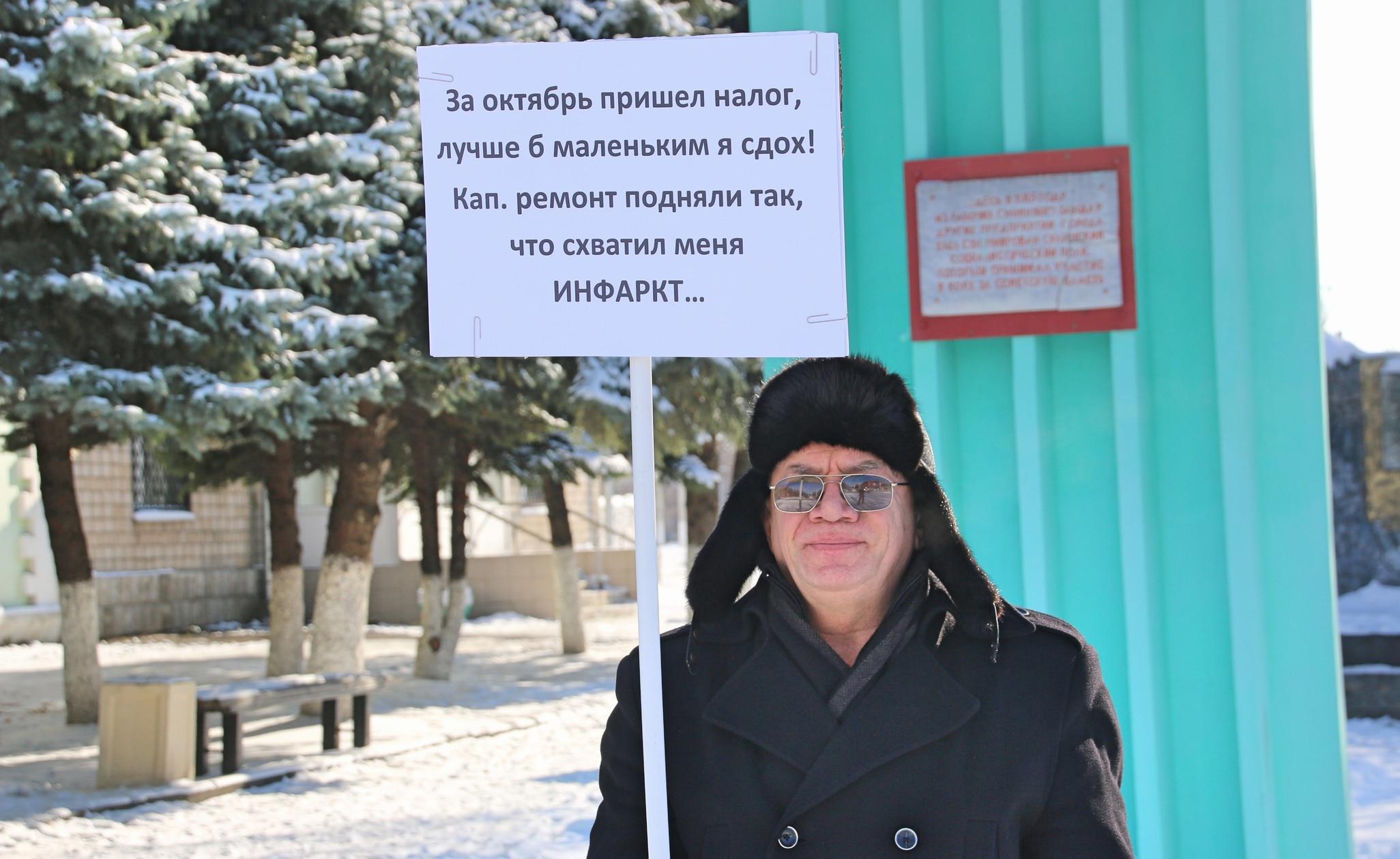 Сегодня пенсионер в Красном Сулине вышел к стеле 50-летия Октября с плакатом "За октябрь пришел налог, лучше б маленьким я сдох! Капремонт подняли так, что схватил меня инфаркт". Прохожие высказывали ему слова поддержки и одобрения. Многие, останавливаясь, жаловались на рост платы за услуги ЖКХ.
