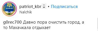 "Давно пора очистить город, а то Махачкала отдыхает", - написал на странице сообщества "Патриот КБР" в Instagram (201 342 подписчиков) пользователь g0rec700.