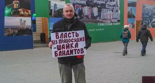 Владимир Тельпук стоял с плакатом против произвола судов. "Суды зачастую выносят незаконные приговоры, - сказал он корреспонденту "Кавказского узла". - Я сам несколько раз сталкивался с беззаконием, когда в суде представляешь доказательства, но суд не принимает их во внимание. Не принимает ни видео, ни фото, ни показания свидетелей".