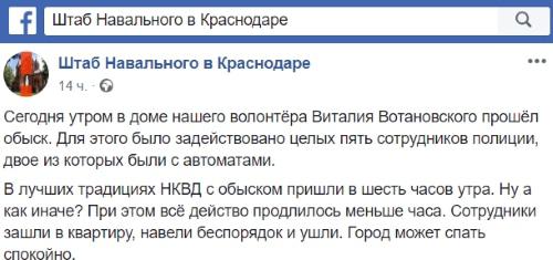 «Сегодня утром в доме волонтера Виталия Вотановского прошел обыск. Для этого было задействовано пять сотрудников полиции, двое из которых были с автоматами. С обыском пришли в 6:00. При этом все действо продлилось меньше часа», - говорится в сообщении краснодарского штаба, опубликованном на странице штаба в Facebook.