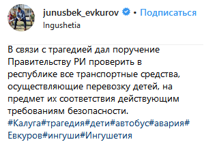 "От имени ингушского народа выражаю искренние соболезнования родным и близким погибших... В связи с трагедией дал поручение правительству РИ проверить в республике все транспортные средства, осуществляющие перевозку детей, на предмет их соответствия действующим требованиям безопасности", - написал Юнус-Бек Евкуров.