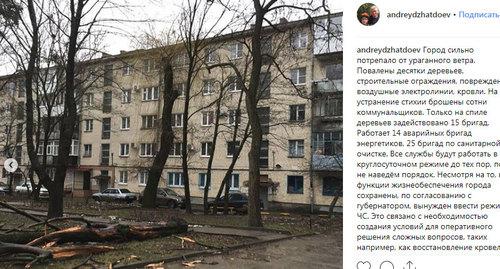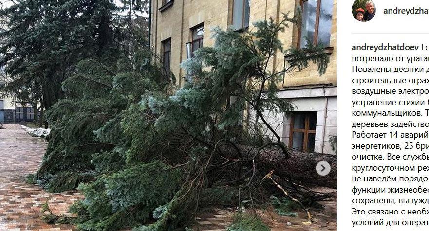 Мэр города Андрей Джатдоев в своем аккаунте в соцсети Instagram подчеркнул, что "все функции жизнеобеспечения города сохранены", однако он был "вынужден ввести режим ЧС". "Это связано с необходимостью создания условий для оперативного решения сложных вопросов, таких, например, как восстановление кровель. По прогнозам синоптиков ураган стихнет во второй половине дня", - пояснил чиновник, разместив фото поваленных деревьев.