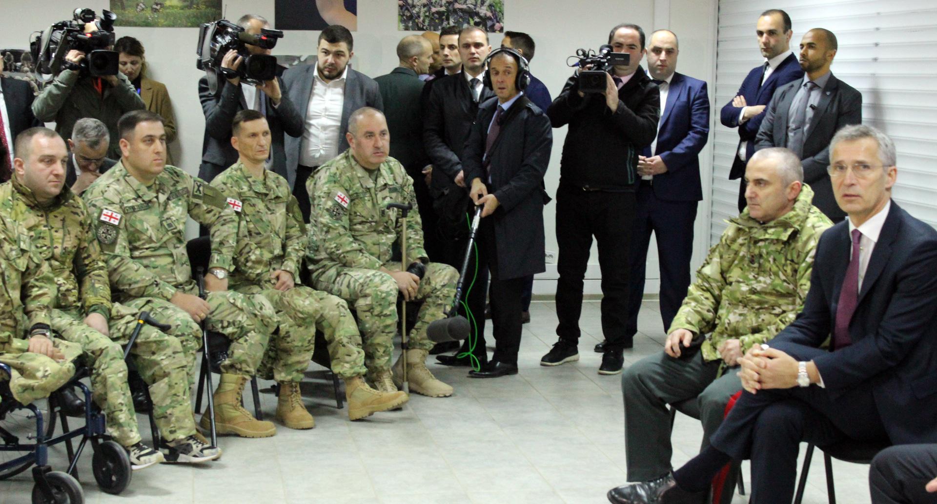 Йенс Столтенберг посетил Совместный центр тренировок и оценок Грузия-НАТО (JTEC) в Крцаниси, где ознакомился с ходом военных учений "НАТО - Грузия 2019", и встретился с грузинскими военными, получившими ранения в Афганистане во время участия в миротворческой операции.