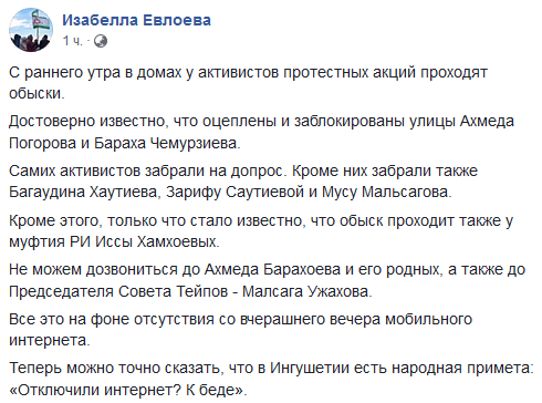 "Кроме этого, только что стало известно, что обыск проходит также у муфтия РИ Иссы Хамхоева. Не можем дозвониться до Ахмеда Барахоева и его родных, а также до председателя совета тейпов - Малсага Ужахова. Все это на фоне отсутствия со вчерашнего вечера мобильного интернета. Теперь можно точно сказать, что в Ингушетии есть народная примета: «Отключили интернет? К беде»", - написала в 08.10 мск журналистка.
