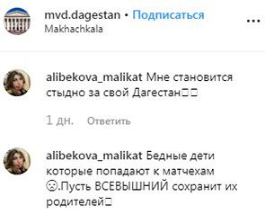 «Мне становится стыдно за свой Дагестан. Бедные дети, которые попадают к матчехам. Пусть Всевышний сохранит их родителей», - написала alibekova_malikat в паблике mvd.dagestan в Instagram. К 21.00 мск 24 июля под новостью здесь оставлено 492 комментария.