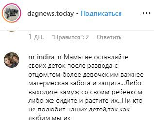 «Мамы, не оставляйте своих деток после развода с отцом, тем более девочек, им важнее материнская забота и защита... Либо выходите замуж со своим ребенком, либо же сидите и растите их... Никто не полюбит наших детей так, как любим мы их», - написала m_indira_n в паблике dagnews.today в Instagram. К 21.00 мск 24 июля под новостью здесь оставлено 37 комментариев.