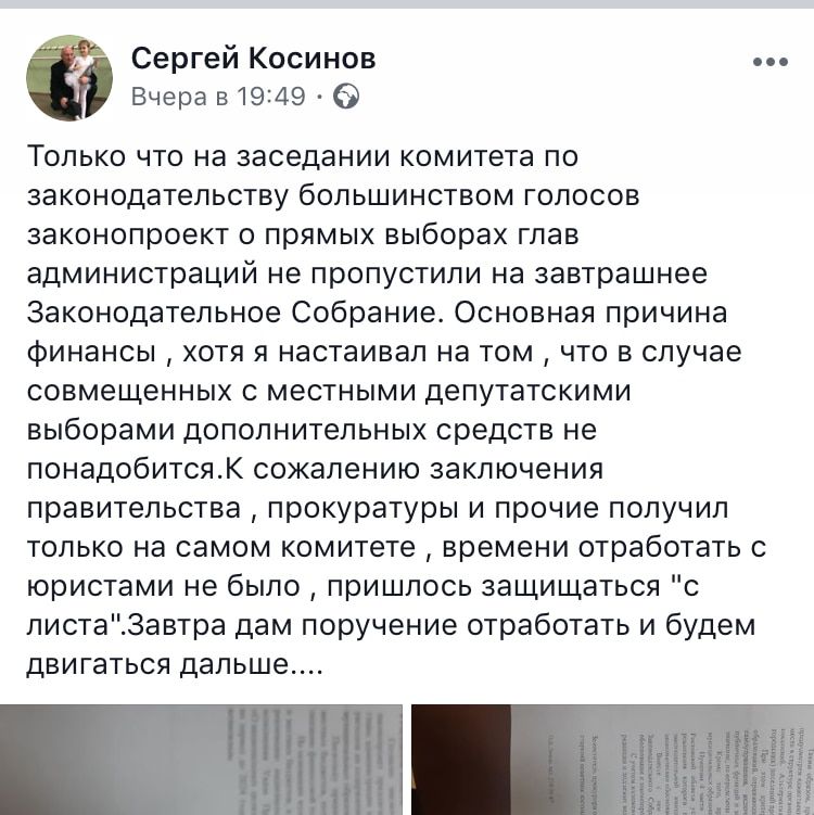 Комитет большинством проголосовал за отказ вносить на рассмотрение парламента Ростовской области данный законопроект, заявил лидер фракции "Справедливой России" в Заксобрании Ростовской области Сергей Косинов. "Основная причина – финансы, хотя я настаивал на том, что в случае совмещения выборов с местными депутатскими выборами дополнительных средств не понадобится. ...Завтра дам поручении [юристам] отработать, и будем двигаться дальше", - написал 24 июля Косинов на своей странице в социальной сети Facebook.