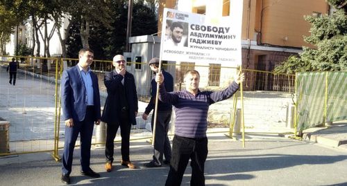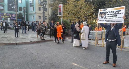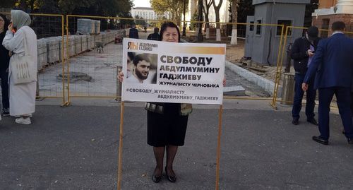 Коллеги арестованного журналиста дагестанского издания "Черновик" Абдулмумина Гаджиева провели 25 октября серию одиночных пикетов в центре Махачкалы близ комплекса зданий республиканских МВД и ФСБ. В акции приняли участие восемь активистов, в том числе неравнодушные горожане.
