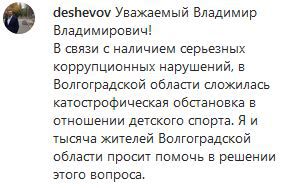 Видеообращение к президенту Павел Дешевов разместил 20 ноября на своей странице в Instagram. "Уважаемый Владимир Владимирович! В связи с наличием серьезных коррупционных нарушений в Волгоградской области сложилась катастрофическая обстановка в отношении детского спорта. Я и тысячи жителей Волгоградской области просим помочь в решении этого вопроса", - говорит на видео тренер.