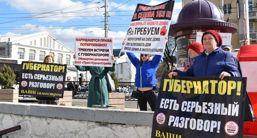 Обманутые дольщики домов, признанных судами самовольными постройками, провели пикет возле Центрального рынка Ростова-на-Дону, потребовав скорейшей встречи с губернатором области для решения вопроса о легализации их жилья либо выплат компенсаций.