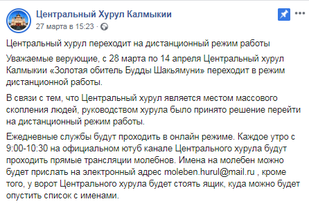 Центральный хурул Калмыкии до 14 апреля будет проводить службы дистанционно, сообщила 27 марта пресс-служба буддийского храма. «Ежедневные службы будут проходить в онлайн-режиме. Каждое утро с 9:00-10:30 на официальном youtube-канале Центрального хурула будут проходить прямые трансляции молебнов. Имена на молебен можно будет прислать на электронный адрес... кроме того, у ворот Центрального хурула будет стоять ящик, куда можно будет опустить список с именами», - указано на странице хурула в соцсети Facebook.
