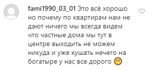 "Это всё хорошо, но почему по квартирам нам не дают ничего. Мы всегда видим, что частные дома. Мы тут в центре выходить не можем никуда и уже кушать нечего", - написал пользователь fami1990_03_01.