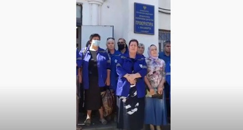 На видео, опубликованном на YouTube-канале издания, десятки людей в основном в медицинской одежде, собираются на ступенях при входе в здание прокуратуры Хасавюрта и на камеру жалуются на руководство скорой помощи.