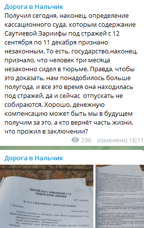 "Государство, наконец, признало, что человек два месяца незаконно сидел в тюрьме. Правда, чтобы это доказать, нам понадобилось больше полугода, и все это время она находилась под стражей, да и сейчас отпускать ее не собираются", - написал Дзугаев в своем Telegram-канале "Дорога в Нальчик", опубликовав копию решения суда.
