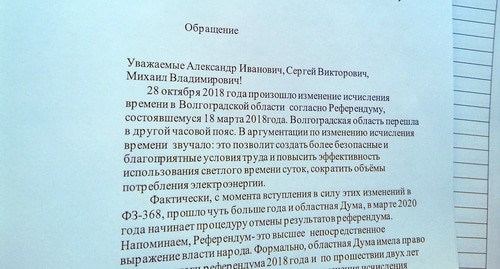 Как сообщал "Кавказский узел", волгоградские парламентарии внесли в Госдуму законопроект о возвращении региона в московский часовой пояс. Противники московского времени указывают, что часовую зону UTC+5 рекомендовал для Волгоградской области Роспотребнадзор, а при использовании московского времени слишком рано темнеет. Активисты 17 сентября отправили президенту собранные ими 18 тысяч подписей против возвращения региона в один часовой пояс с Москвой и готовы дойти с жалобами до Верховного суда.
