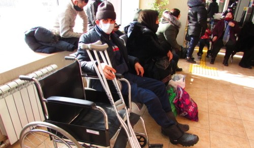 В зале ожиданий, предназначенном для семей с маленькими детьми, было тепло и светло. Все кресла там были заняты. В вестибюле у окна сидел мигрант , рядом с ним стояло кресло-коляска, на котором лежали костыли. Он плохо говорил по-русски, поэтому его речь переводил молодой человек, стоявший рядом.