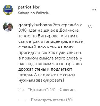 Публикация о введении режима КТО в Нальчике и Баксане была размещена 3 июля на странице Instagram-паблика patriot_kbr, на который подписаны около 359 тысяч пользователей. К 09.00 эта запись набрала 1363 отметок "нравится" и 217 комментариев. Часть их авторов пожаловалась на интенсивную стрельбу. "Эта стрельба [в Нальчике] с 03.40 [мск] идет на дачах в Долинске. Те, что по Биттирова. А я там - в ста метрах от эпицентра. Вместе с семьей всю ночь на полу просидели, так как пули свистят, в прямом смысле этого слова, у нас над головами, а от взрывов дрожат стены и подлетают шторы. А нас даже не сочли нужным эвакуировать", – возмутился georgiykurbanov.