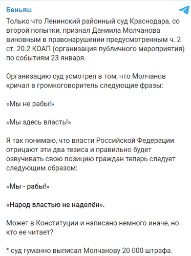 "Организацию суд усмотрел в том, что Молчанов кричал в громкоговоритель следующие фразы: «Мы не рабы!», «Мы здесь власть!». Я так понимаю, что власти Российской Федерации отрицают эти два тезиса, и правильно будет озвучивать свою позицию граждан теперь следует следующим образом: «Мы - рабы!», «Народ властью не наделён». Может, в Конституции и написано немного иначе, но кто ее читает?" - прокомментировал Беньяш решение суда 9 июля в своем Telegram-каналале.