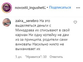 Запись о поборах в школах также была опубликована 10 сентября в Instagram-паблике novosti_ingushetii, на который подписано около 238 тысяч подписчиков. "Здравствуйте! Я бы хотел, чтобы хоть кто-то повлиял на [руководство одной из школ в Малгобеке]. Там каждый день почти просят деньги за разные вещи. То кулер под воду по 2000 рублей, теперь вешалки для детей по 350 рублей. У нас пятеро детей, мы и так в долги влезли. <…> Только девятый учебный день начался, а поборы пошли. <…> Неужели в республики нету денег, куда смотрят наши чиновники?" – приведены в описании публикации слова одного из подписчиков.