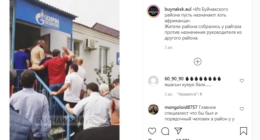 Публикация об акции протеста жителей Буйнакска против назначения руководителя из другого района была размещена 20 сентября в Instagram-паблике buynaksk.aul, на который подписаны более 57 тысяч пользователей. На кадрах видео, прикрепленного к записи, показано здание, на входе в которое висит баннер с логотипом "Газпрома". Около входа стоят около двух десятков человек. Обстановка в целом, судя по кадрам видео, на месте спокойная.