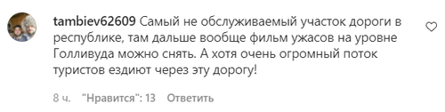 "Самый необслуживаемый участок дороги в республике, там дальше вообще фильм ужасов на уровне Голливуда можно снять. А хотя очень огромный поток туристов ездит через эту дорогу!" - согласился tambiev62609.
