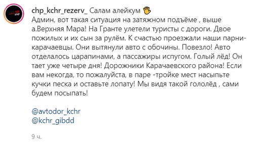 "На затяжном подъёме, выше аула Верхняя Мара на Гранте улетели туристы с дороги. Двое пожилых и их сын за рулём. К счастью, проезжали наши парни-карачаевцы. Они вытянули авто с обочины. Повезло! Авто отделалось царапинами, а пассажиры испугом. Голый лёд! Он тает уже четыре дня!" - говорится в сообщении от 30 октября в сообществе chp_kchr_rezerv_ в Instagram, насчитывающем 42,3 тысячи подписчиков.