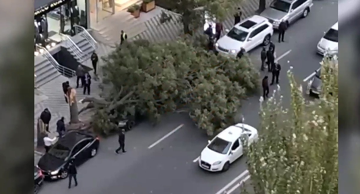 Ураган также повалил деревья в Баку на припаркованные машины, сказано в другом сообщении издания. К публикации прикреплен также ролик, на кадрах которого показано упавшее на автомобиль дерево, рядом расположены здания, ходят люди. На улице оживленное движение.