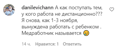 "А как поступать тем, у кого работа не дистанционно? Я снова, как 1-3 ноября, вынуждена работать с ребенком. Медработник, называется", - отметила danilevichann. "Что значит "проявить понимание"? А если не проявят? Объявляйте тогда уже карантин. Пусть работающим родителям открывают больничный! Как снег на голову такие решения!" – возмутилась annaiunel.