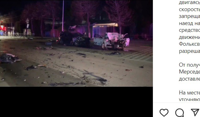По предварительным данным, водитель автомобиля Mercedes на высокой скорости проехал на запрещающий сигнал светофора, столкнулся со стоявшим в попутном направлении Datsun, а затем выехал на встречную полосу, где столкнулся еще с двумя автомобилями, которые стояли на перекрестке в ожидании разрешающего сигнала светофора, сообщило сегодня управление ГИБДД по Ставропольскому краю на своей странице