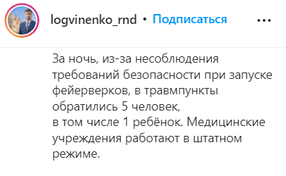 Все они пострадали "из-за несоблюдения требований безопасности при запуске фейерверков", - говорится в сообщении от 1 января на странице главы администрации logvinenko_rnd в Instagram.