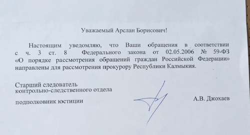 Управление Следственного комитета по Калмыкии передало в прокуратуру республики заявление депутата Народного хурала Арслана Кусьминова с просьбой проверить законность действий администрации Элисты, выдавшей 20 декабря 2021 года разрешение на эксплуатацию дома. Ответ на свое обращение в Следственный комитет, датированный 17 января, Кусьминов получил 20 января, копия ответа есть в распоряжении "Кавказского узла".