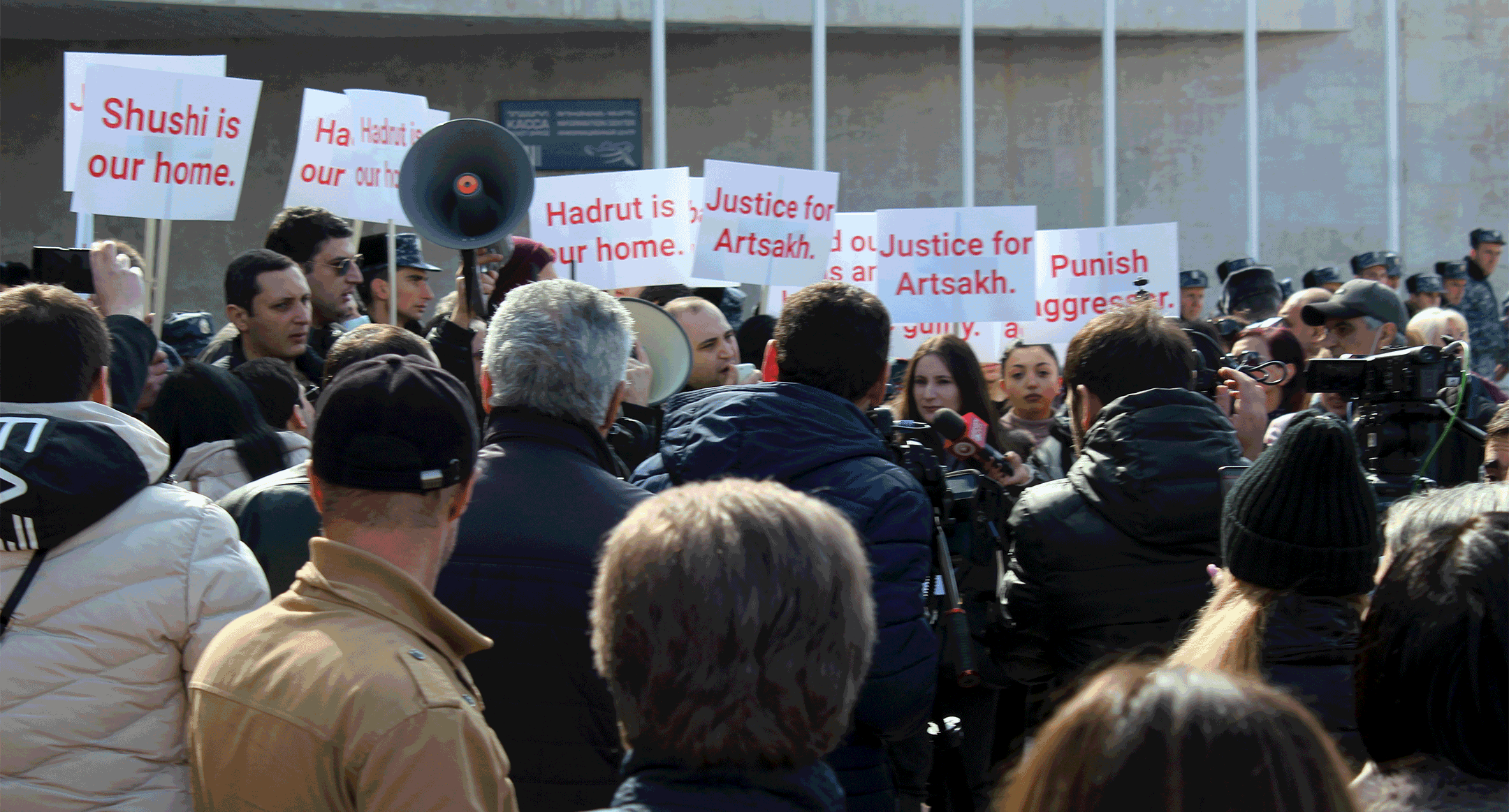 Активисты держали в руках плакаты с надписями: "Justice for Artsakh" (Справедливость для Нагорного Карабаха), "Shushi is our home" (Шуши – наш дом), "Hadrut is our home" (Гадрут – наш дом), "Azerbaijan is guilty" (Азербайджан виновен), "Genocide is not war! It is more dangerous than war" (Геноцид – это не война! Это опаснее войны), скандировали: "Армения без турков!", "Без Никола Армения!", "Карабах – наш!".