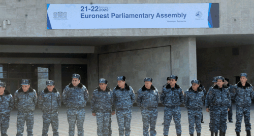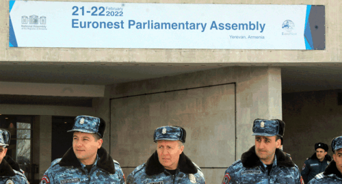 Активисты следили за прямым эфиром с заседания "Евронест". После выступления азербайджанского делегата несколько активистов – участников карабахской войны – попытались прорвать полицейский кордон и войти в здание комплекса, однако правоохранители пресекли их действия.