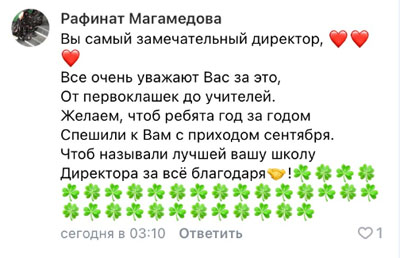 "Честные, умные, достигающие больших успехов люди никогда на подобных должностях долго не задерживаются . Им нужны те, кем можно управлять как марионеткой. Этот человек действительно не глупый, грамотный, а главное – он знает свое дело и идёт, достигает цели несмотря на возникающие на его пути сложности. Дай Аллах, чтобы у детей впереди корабля остался мудрый, умный капитан, чтобы у детей не прекращались радостные и горящие глаза рядом с ним", – написала Nastya Khuseinova.